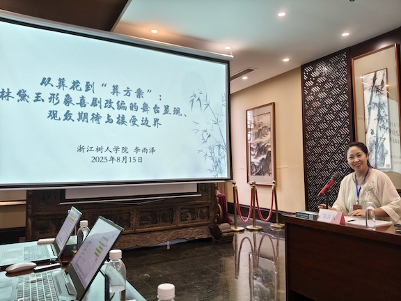 分組討論會(huì)上,來(lái)自浙江樹人學(xué)院的紅學(xué)研究者李雨澤也深刻體會(huì)到,數(shù)字技術(shù)的普及顯著改變了經(jīng)典文學(xué)形象的傳播路徑。她以喜劇演員姚堯通過(guò)《黛玉播播間》《黛玉三撕》《點(diǎn)點(diǎn)關(guān)注》三部喜劇作品對(duì)林黛玉形象的舞臺(tái)重塑為例,來(lái)闡釋為何引發(fā)了觀眾截然不同的反應(yīng)。