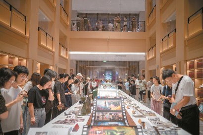 走進(jìn)徐家匯書院,一樓中庭的長桌上,“拾光匯影——紀(jì)念中國電影誕生120周年特展”復(fù)現(xiàn)了一條影視長河,呈現(xiàn)了徐匯的電影公司、電影人物的歷史以及與電影有關(guān)的建筑故事。當(dāng)晚,徐家匯書院的每個區(qū)域都精心布置了與電影相關(guān)的互動體驗,令人仿佛置身于一個光影交織的世界,每位參與者既是觀眾也是演員,既是讀者也是作者。各個樓層之間以《大鬧天宮》《好東西》《郵緣》《聶耳》四部具有徐匯元素的電影進(jìn)行串聯(lián),還設(shè)置了“電影可描摹”場景打卡、電影街區(qū)地圖以及邂逅電影NPC等環(huán)節(jié)。