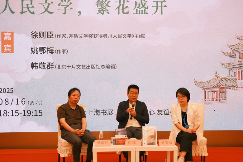 8月16日下午,上海書展活動之一“京腔京韻,海風(fēng)海雨,人民文學(xué),繁花盛開”文學(xué)對談在上海展覽中心友誼會堂舉辦?;顒佑伞度嗣裎膶W(xué)》雜志、北京十月文藝出版社、上海新華傳媒連鎖有限公司共同主辦。茅盾文學(xué)獎獲得者、《人民文學(xué)》主編徐則臣,作家姚鄂梅與北京十月文藝出版社總編輯韓敬群,共同做客上海展覽中心友誼會堂,融“京腔京韻,海風(fēng)海雨”為一堂,與讀者一起聊讀書,話文學(xué)。