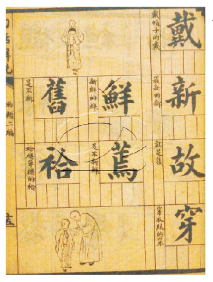 當(dāng)然,如此粗疏的分類法到底還是會(huì)導(dǎo)致一些問(wèn)題,比如面對(duì)歸入“實(shí)字”的形容詞,施崇恩就很費(fèi)腦筋,且不說(shuō)“藍(lán)”只能解釋為“洋藍(lán)的藍(lán)”,“紅”是“紅綠的紅”,遇到“新”“舊”之類更是只能無(wú)奈解釋為“新鮮的新”和“是不新”,相當(dāng)于沒(méi)有解釋。
