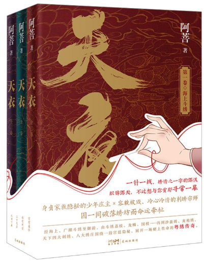 《天衣(全三卷)》包括《海上斗繡》《廣潮斗繡》《龍袍斗繡》,以有1000多年歷史、中國(guó)四大名繡之一的粵繡(即廣州刺繡、潮州刺繡)行業(yè)的發(fā)展為故事背景,從明“隆慶開關(guān)”出發(fā),以伊麗莎白一世促成英國(guó)刺繡同業(yè)公會(huì)為結(jié)束,講述了一個(gè)從海上、民間到天子座前的斗繡傳奇。