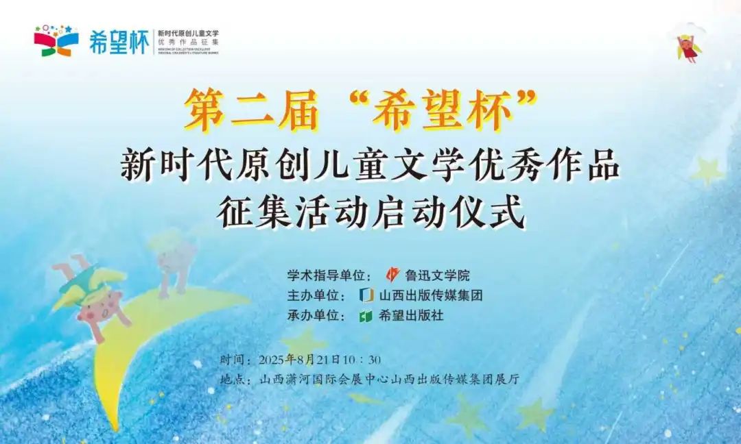 8月21日上午,由魯迅文學(xué)院擔(dān)任學(xué)術(shù)指導(dǎo),山西出版?zhèn)髅郊瘓F主辦、希望出版社承辦的第二屆“希望杯”新時代原創(chuàng)兒童文學(xué)優(yōu)秀作品征集活動啟動儀式,在山西瀟河國際會展中心山西出版?zhèn)髅郊瘓F展廳隆重舉行。本次活動以習(xí)近平新時代中國特色社會主義思想為指導(dǎo),深入貫徹落實習(xí)近平文化思想,緊扣黨的二十大關(guān)于文化建設(shè)的戰(zhàn)略部署,圍繞建設(shè)社會主義文化強國的目標,圍繞“與時代呼應(yīng) 為兒童創(chuàng)作”的核心主題,旨在進一步推動原創(chuàng)兒童文學(xué)高質(zhì)量發(fā)展,鼓勵創(chuàng)作者書寫新時代少年兒童的生活與精神世界,講好中國故事,切實承擔(dān)“舉旗幟、聚民心、育新人、興文化、展形象”的使命任務(wù)。