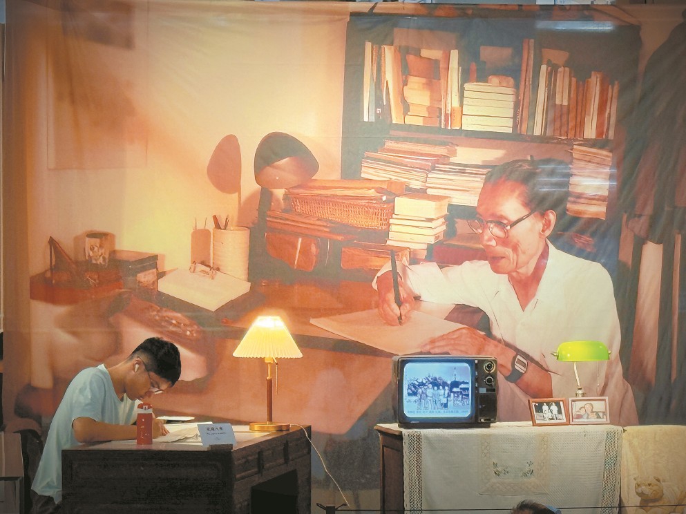 上圖東館手稿主題館展覽現(xiàn)場,小讀者在主視覺區(qū)的仿真書桌與夏衍“對(duì)坐”。