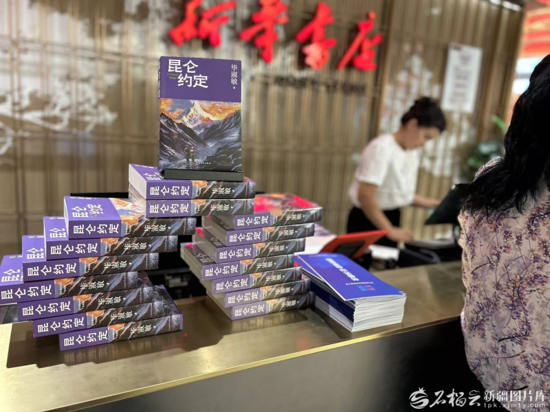 8月24日,喀什書城里,處處擺滿了《昆侖約定》。石榴云/新疆日報記者 阿比拜攝