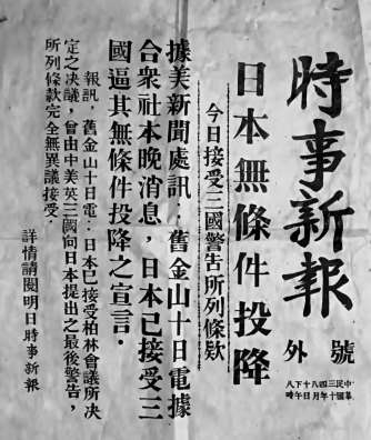 事實上,早在1945年8月10日,日本政府即已分別電請中立國瑞典、瑞士,將其投降之意愿轉(zhuǎn)達中、美、英、蘇四國,“日本政府決定無條件投降”的消息遂通過無線電波傳遍世界。當時,身處中國西南一隅的陳寅恪,究竟通過何種渠道獲知此訊,至今尚未見有確切的考證予以說明。不過,僅據(jù)筆者所知所見,抗戰(zhàn)期間將總部從上海遷至重慶的《時事新報》,確曾于1945年8月10日這一天下午印發(fā)過一份“號外”,日本無條件投降的消息,就赫然印于這份“號外”之上。當晚成渝兩地民眾可憑此“號外”,較早獲悉這一消息,確為事實。
