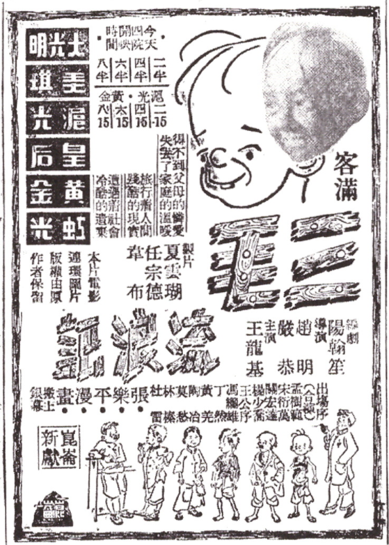 1949年4月1日,電影《三毛流浪記》開拍,1949年10月上映,影片片頭載明“昆侖影業(yè)股份有限公司”“制片 夏云瑚 任宗德 韋布”“原作 張樂平”“編劇 陽翰笙”“制作主任 韋布”“導演 趙明 嚴恭”“三毛——王龍基”,以及漫畫三毛形象等內(nèi)容,影片時長約70分鐘。