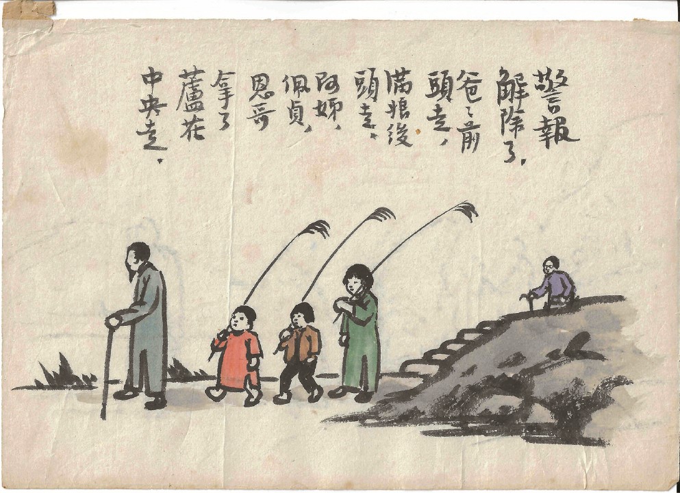 他還曾畫過多幅躲避空襲的漫畫,這些作品構(gòu)思巧妙,不畫人們的驚慌無措,而是畫人們的鎮(zhèn)定自若,甚至悠然自得。他的小兒子出生于逃難途中,逃警報(bào)成為孩子的日常,他畫《恩狗逃警報(bào)》,三個(gè)人愜意地坐在一塊大石頭上,畫上題到:“逃警報(bào)的路上,水里一個(gè)石頭堆,像一只船,我們跨上去,坐著看水。阿姊拿司的克搖船。”在《警報(bào)解除了》中,他畫老少五人漫步山中,畫上題到:“警報(bào)解除了,爸爸前頭走,滿娘后頭走,阿姊、佩貞、恩哥拿了蘆花中央走。”逃警報(bào)成了逍遙游。他畫防空洞里埋頭看書的人,防空洞成了桃花源。他畫《警報(bào)作媒人》,青年男女因在山洞里躲避空襲而成就一世良緣,警報(bào)成了月老。這些恬靜安寧的畫面,是對(duì)敵人的藐視,對(duì)和平的向往。他的次女林先在抗戰(zhàn)期間舉行婚禮,他作此畫作為賀禮。女兒生了孩子后,他創(chuàng)作《大樹垂枝,保我赤子》,以此祝福外孫在祖國的懷抱里茁壯成長??箲?zhàn)勝利后,他畫《勝利之夜》,畫中那個(gè)被高舉在空中的孩子,正是“大樹”所保的赤子。