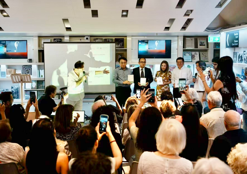 張凌霄參贊、胡曉東副總經(jīng)理、瓦倫蒂娜·基亞雷莉和張在健社長為新詩集揭幕