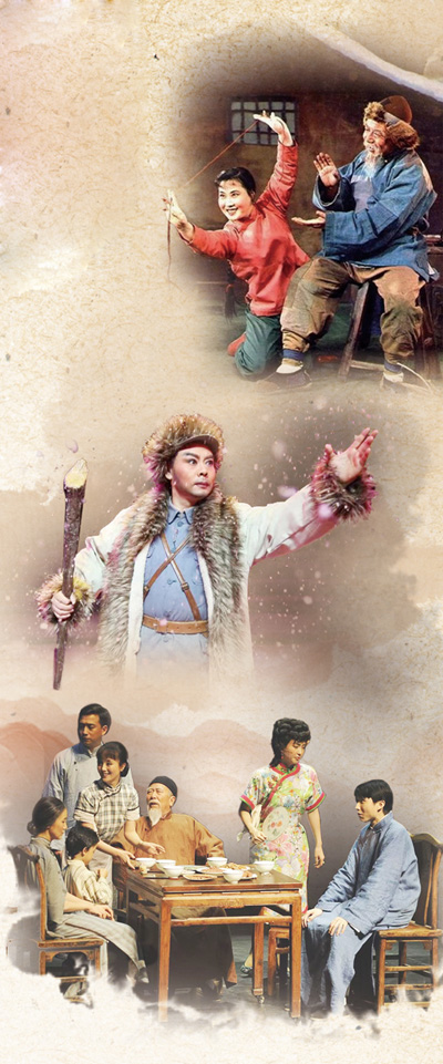 圖片從上至下依次為歌劇《白毛女》(郭蘭英主演)、京劇《楊靖宇》、話劇《四世同堂》劇照。