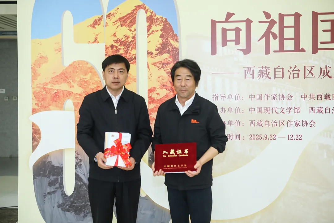 扎西達(dá)娃(右)代表西藏自治區(qū)文聯(lián)向中國現(xiàn)代文學(xué)館捐贈圖書,中國現(xiàn)代文學(xué)館常務(wù)副館長王軍接受捐贈
