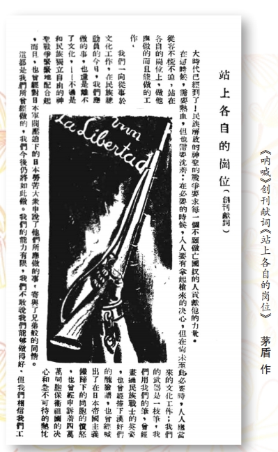 在籌備階段,茅盾因在文學(xué)界的崇高地位而備受《吶喊》籌備組眾人的信賴,主動(dòng)承擔(dān)了《吶喊》的早期主編工作和發(fā)起責(zé)任。在創(chuàng)刊號(hào)中,他發(fā)表了《站上各自的崗位》一文,疾呼:“大時(shí)代已經(jīng)到了!民族解放的神圣的戰(zhàn)爭(zhēng)要求每一個(gè)不愿做亡國(guó)奴的人貢獻(xiàn)他的力量?!痹谖恼轮兴麖?qiáng)調(diào),非常時(shí)期的文學(xué)工作者應(yīng)該承擔(dān)責(zé)任,保持沉著,他號(hào)召大家“站在各自的崗位上,做他應(yīng)做的而且能做的工作”??锔?,他又在《烽火》創(chuàng)刊號(hào)中用《戰(zhàn)神在嘆氣》一文,犀利抨擊日軍的狂妄與殘暴:“你不是說過么,滅亡你的鄰邦只要二十四小時(shí)?……原來你只會(huì)嚇一些軟骨頭的‘恐日病者’,你一向只會(huì)夸嘴!”以此表達(dá)對(duì)侵華日軍的憤怒與不屑。雖然茅盾先生后來因戰(zhàn)局惡化被迫離開上海,但他沒有放棄寫作,仍然堅(jiān)持向《烽火》寄回他在流轉(zhuǎn)途中創(chuàng)作的散文、短論及報(bào)告文學(xué),真實(shí)記錄戰(zhàn)爭(zhēng)苦難與民眾抗?fàn)?,為抗?zhàn)時(shí)期的文藝事業(yè)留下了一批珍貴文獻(xiàn)。