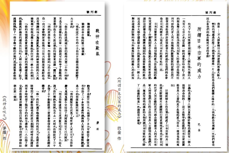 同樣不可忽視的是巴金在《烽火》出版過程中的關(guān)鍵作用。作為《吶喊》和《烽火》的聯(lián)合創(chuàng)刊人之一,巴金不僅全程參與了從《吶喊》到《烽火》的編輯出版工作,更是從《烽火》第六期開始接任了茅盾的主編任務(wù)。在戰(zhàn)火紛飛、出版條件極其困難的情況下,巴金始終堅(jiān)持組稿和撰寫文章,甚至為了確保了刊物的持續(xù)出版,他隨身攜帶未刊稿件,輾轉(zhuǎn)于中國(guó)南方地區(qū)躲避戰(zhàn)爭(zhēng)并隨時(shí)尋找機(jī)會(huì)進(jìn)行刊印。巴金的文學(xué)創(chuàng)作一直以直面現(xiàn)實(shí)、情感熾烈和附有批判性而著稱,在為刊物供稿的過程中,他將個(gè)人情感與民族命運(yùn)緊密結(jié)合,用文字向社會(huì)傳達(dá)了人民的處境和心聲。1937年8月28日,日軍轟炸上海南站,造成大量平民傷亡,巴金憤慨萬分,提筆撰寫了《所謂日本空軍的威力》一文發(fā)表在《烽火》上,嚴(yán)詞譴責(zé)日軍:“這不是戰(zhàn)爭(zhēng),這是謀殺!日本空軍展露給世界人士看的,并不是它的威力,而是一種虐他性的瘋狂!”他將日軍稱為“一群沒有理性的渴血生物”,以此來表達(dá)他作為中國(guó)人的憤怒和作為一名作家的良知。據(jù)重慶師范大學(xué)統(tǒng)計(jì),巴金先后在《吶喊》與《烽火》上發(fā)表各類作品30余篇,體裁涵蓋雜文、小說、詩(shī)歌與譯作,是《吶喊》和《烽火》供稿最多、影響最大的核心作者之一。