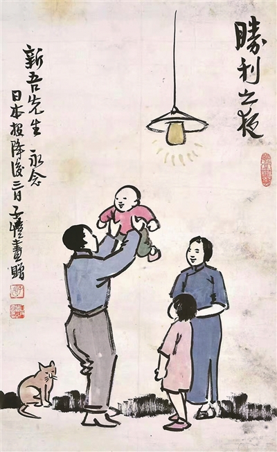 1945年8月10日,當(dāng)電臺(tái)里傳來日本接受《波茨坦公告》全面無條件投降的消息時(shí),重慶的大街小巷人們奔走相告,慶祝勝利的鞭炮聲此起彼伏。當(dāng)時(shí)避居山城的豐子愷,有感于此,繪制了《卅四年八月十日之夜》——父親喜不自禁,將孩子高高舉過頭頂,象征光明和勝利的燈光照亮畫面。豐子愷通過一個(gè)家庭的溫暖瞬間,描繪了抗戰(zhàn)勝利之夜的人民心聲。隨之,豐子愷在此基礎(chǔ)上再繪《勝利之夜》,畫面中的紫衣男孩換作笑容溫婉的母親。9月2日,日本代表在美軍“密蘇里”號(hào)軍艦簽署無條件投降書,豐子愷即作《炮彈作花瓶 萬世樂太平》——桌面上的炮彈殼成為花瓶,寓意和平的荷花插入其中,兩個(gè)兒童玩具倚放其旁,展現(xiàn)了他對(duì)世界和平的美好祈愿。