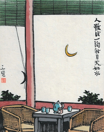 之所以是“古詩新畫”,在于豐子愷在研讀古代詩文時(shí),真切感受到其穿越時(shí)間的魅力。宋代蘇軾提出“詩畫本一律”之說,明確了詩畫相通的理論。豐子愷在《畫中有詩》自序中談道:“余讀古人詩,常覺其中佳句,似為現(xiàn)代人生寫照,或竟為我代言。蓋詩言情,人情千古不變,故好詩千古常新?!本拖衿涑擅鳌度松⒑?,一鉤新月天如水》,就源于宋代詞人謝逸《千秋歲·詠夏景》中的最后一句。