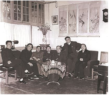 1960年,戲劇家們?cè)诒本堊灾衣窔W陽予倩家中,左起:陳白塵、陽翰笙、張庚、夏衍、歐陽予倩、田漢、李伯釗
