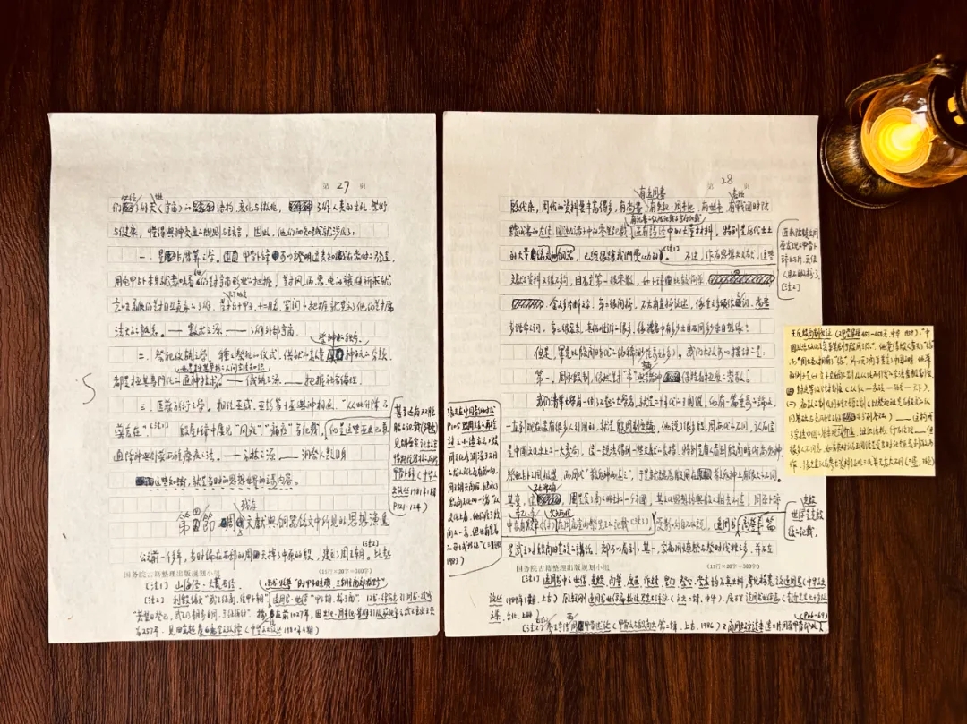 在動筆寫講義之前,我翻過好多中國思想史著作,從大部頭的侯外廬,到薄薄的常乃惪,從只講古代的楊榮國,到專講當代的郭湛波,從德國的佛克(Alfred Forke),到日本的武內(nèi)義雄,當然,也包括各種不叫思想史而叫哲學(xué)史的書,從胡適、馮友蘭到任繼愈??晌覍@些著作都不太滿意,覺得不能拿這些書當現(xiàn)成教材,只好自己從頭寫,往往是一邊寫一邊講,有時甚至前一天才寫好講稿,第二天就拿到課堂給學(xué)生講。那時候還年輕,又正值小平南方談話,各種新知也漸漸冒頭,所以寫的時候和講的時候,不斷會有新想法涌現(xiàn)。寫好就講,講完再改,講稿上貼滿各色貼紙,無論在形式上、資料上以及觀念上,離當時各種中國思想史或哲學(xué)史就越來越遠。