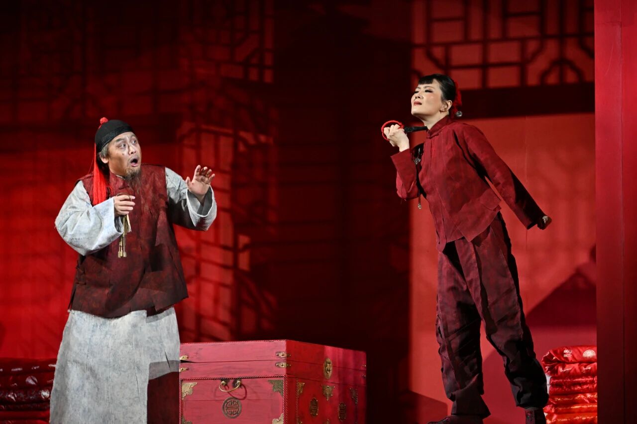 小說(shuō)的線性敘事難以展現(xiàn)視覺(jué)與音樂(lè)切換所產(chǎn)生的巨大張力,而這正是歌劇藝術(shù)的魅力所在。在第二場(chǎng)中,一座精雕細(xì)琢的中式婚床成為舞臺(tái)核心,九兒身披紅嫁衣,靜坐于血色光影中,周遭的紅燈籠、錦緞鋪蓋,共同構(gòu)筑起一個(gè)華麗而壓抑的封建牢籠。當(dāng)患有肺癆的單扁郎踉蹌闖入,在婚床上展開(kāi)一場(chǎng)追逐時(shí),戲劇的荒誕感油然而生。他唱腔滑稽,強(qiáng)調(diào)“姻緣天定”;九兒的回?fù)魟t如驚雷,唱出“寧死不嫁漢奸”的決絕。二人風(fēng)格迥異的唱段形成尖銳對(duì)抗:?jiǎn)伪饫傻某粠е邓椎慕器?,九兒的反擊則如山崩地裂。于是,婚床化身“戲臺(tái)”,上演著一場(chǎng)被圍觀的儀式。這種“臺(tái)中臺(tái)”的嵌套設(shè)計(jì),極大地濃縮了沖突,讓個(gè)體的反抗在與環(huán)境、命運(yùn)的對(duì)抗中,迸發(fā)出悲劇性的崇高感。更加震撼人心的,是緊隨其后的場(chǎng)景切換:舞臺(tái)從壓抑可怖的婚床轉(zhuǎn)變?yōu)闊o(wú)邊的高粱地。余占鰲與九兒在此深情重唱,那簡(jiǎn)單的問(wèn)答“這里就是家”,與先前場(chǎng)面形成天壤之別。情感如野火般掙脫所有束縛,使這片高粱地化作一場(chǎng)對(duì)生命、自由與愛(ài)最直接、最熱烈的禮贊。