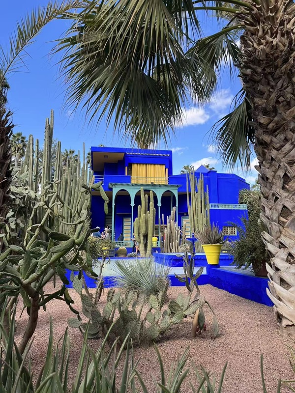 1966年,圣羅蘭和同伴貝爾熱第一次游歷摩洛哥。摩洛哥這個(gè)國家,特別是馬拉喀什這個(gè)城市,其鮮艷的色彩深深影響了圣羅蘭,為他帶去了很多靈感。當(dāng)他在馬拉喀什發(fā)現(xiàn)了馬約爾花園時(shí),立刻“被這片馬蒂斯的色彩與大自然的色彩相融合的綠洲所吸引”。1924年,法國畫家雅克·馬約爾購得這塊土地,并建造了一座花園。1980年,圣羅蘭和貝爾熱成為了這里的新主人,對(duì)花園進(jìn)行了大規(guī)模的修復(fù)工作。畫家雅克·馬約爾的工作室被改造成一個(gè)面向公眾開放的柏柏爾博物館,展出圣羅蘭和貝爾熱的藏品。自1966年起,每年6月和12月,圣羅蘭都會(huì)在馬拉喀什度過兩周時(shí)間,設(shè)計(jì)他的高定時(shí)裝系列。2008年6月1日,圣羅蘭因腦癌去世,享年71歲。貝爾熱把圣羅蘭的骨灰埋在了馬約爾花園。距離花園不遠(yuǎn)處的圣羅蘭博物館于2017年對(duì)外開放,和巴黎的圣羅蘭博物館遙相呼應(yīng),共同紀(jì)念這位偉大的藝術(shù)家。漫步在馬約爾花園,這種被命名為“馬約爾藍(lán)”的色調(diào)格外醒目,讓游客以為來到了色彩斑斕的夢(mèng)幻天堂。