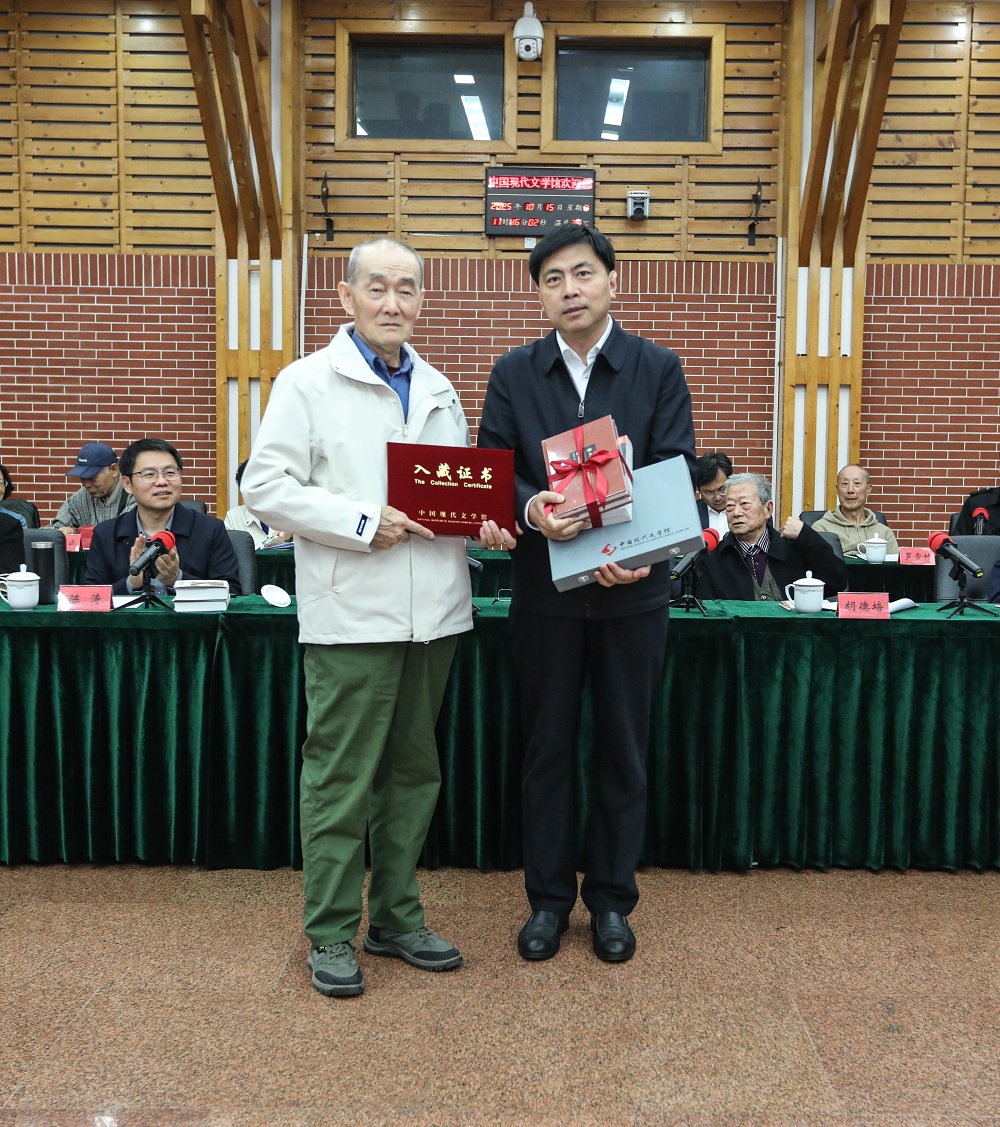嚴(yán)文井之子嚴(yán)欣強向中國現(xiàn)代文學(xué)館捐贈嚴(yán)文井手稿,中國現(xiàn)代文學(xué)館常務(wù)副館長王軍接受捐贈,并向嚴(yán)欣強頒發(fā)入藏證書。