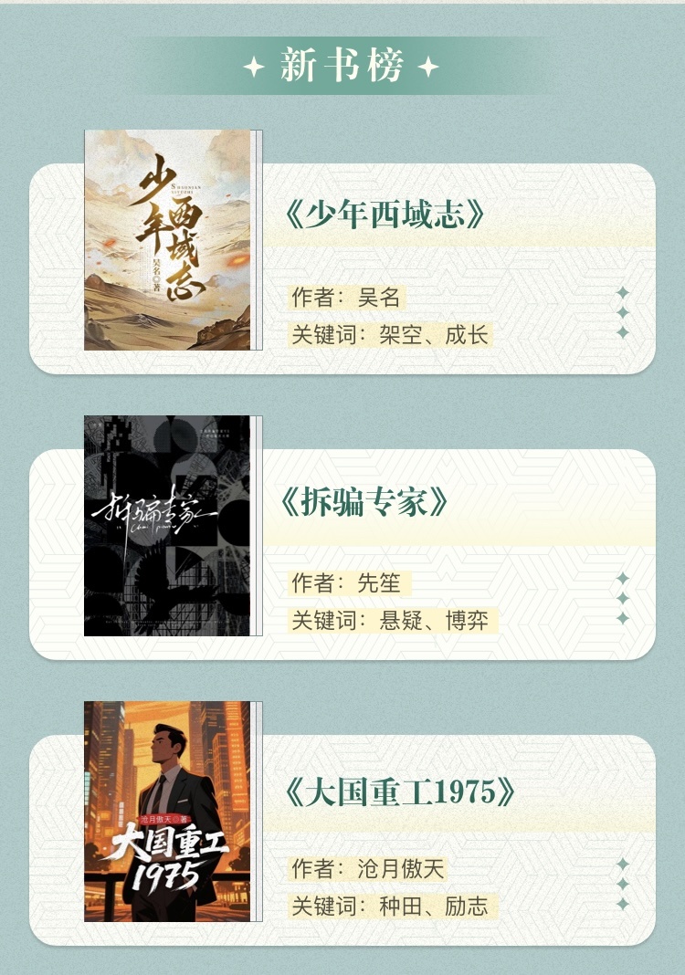 在新書榜中,三部新作對敘事與結(jié)構(gòu)實現(xiàn)了新的創(chuàng)新與突破?!渡倌晡饔蛑尽窂莫毺氐奈饔蛞暯沁M行武俠創(chuàng)作,是武俠創(chuàng)作中少有的一次突破性類型融合實踐。《拆騙專家》創(chuàng)新采用雙視角敘事手法拓展刑偵文學(xué)的創(chuàng)作維度,以立體人物構(gòu)建現(xiàn)實隱喻,深刻體現(xiàn)了網(wǎng)絡(luò)文學(xué)直面現(xiàn)實、剖析人性的創(chuàng)作自覺?!洞髧毓?975》將“重生”敘事與工業(yè)史詩有機融合,不僅打破了網(wǎng)絡(luò)文學(xué)“輕娛樂”的固有認知,更以民族記憶與時代發(fā)展為創(chuàng)作根基,為題材創(chuàng)新提供了兼具思想深度與文化厚度的實踐范式。