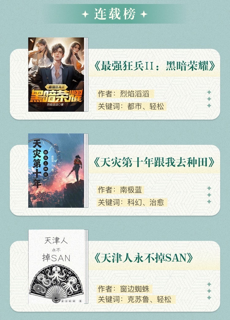 連載榜的三部作品,憑借新穎有趣的題材持續(xù)獲得廣泛關(guān)注?!蹲顝娍癖颍汉诎禈s耀》作為經(jīng)典男頻網(wǎng)文《最強狂兵》的續(xù)作,延續(xù)前作構(gòu)建的世界觀,將家族復(fù)興的主題與都市異能結(jié)合,并融入許多新興勢力,成功拓展了題材邊界,為類型創(chuàng)作注入了新鮮活力?!短鞛?zāi)第十年跟我去種田》立足末日語境,主角夏青于文明傾覆十年后開啟破局之旅——以農(nóng)業(yè)為根基復(fù)蘇生產(chǎn)力,以社群為紐帶重建社會契約,在廢墟之上踐行人類文明的延續(xù)使命?!短旖蛉擞啦坏鬝AN》以克蘇魯為題材,將西方恐怖敘事與天津地域文化成功結(jié)合,將克蘇魯風(fēng)格實現(xiàn)了本土化改造。