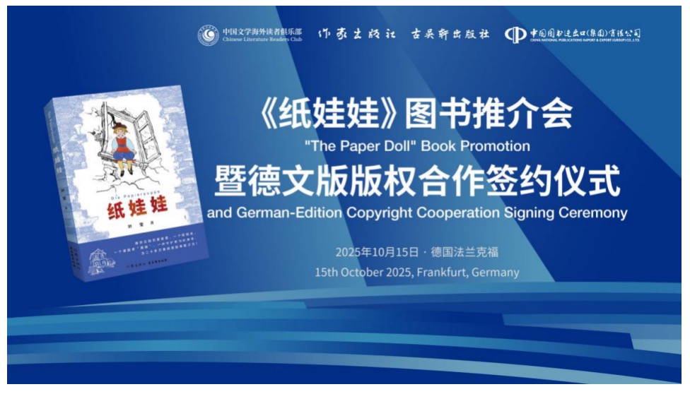 近日,由中國作家協(xié)會外聯(lián)部指導(dǎo),德國中國文學(xué)讀者俱樂部、作家出版社、古吳軒出版社、中國圖書進(jìn)出口(集團(tuán))有限公司聯(lián)合主辦的《紙娃娃》圖書推介會暨德文版版權(quán)合作簽約儀式在德國法蘭克福書展期間舉行。本次活動以“跨越時空的和平敘事”為主題,匯聚中德出版界、作家、翻譯家及媒體代表,以兒童的視角,講述了世界反法西斯戰(zhàn)爭中的大愛故事?;顒佑陕玫略娙?、作家昔月主持,作家葉瑩以視頻方式參加活動。