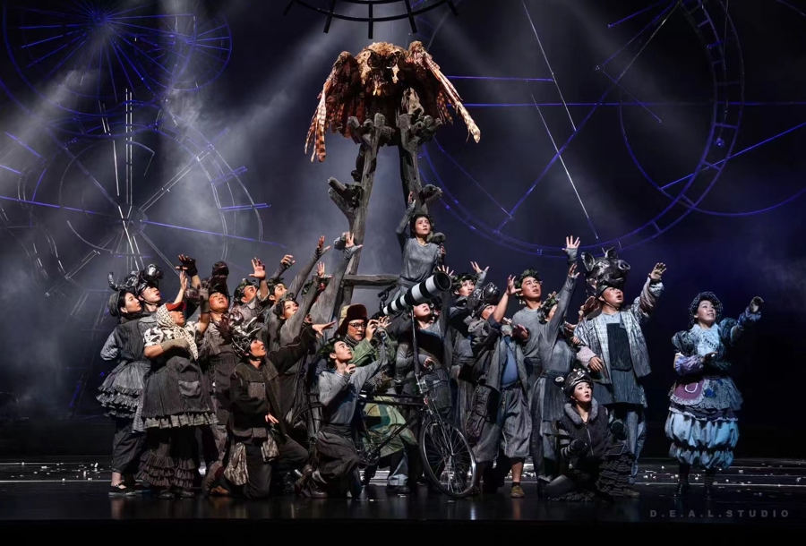 他們的創(chuàng)造是全方位的,編導(dǎo)演、舞美、音樂合流,每一個(gè)細(xì)部,都充滿了尋常意義上的不確定性。比如對星空的表現(xiàn),最后立到舞臺(tái)上的“布景”,竟然沒有一顆星星,全是鄉(xiāng)場上那些水磨、輪盤等農(nóng)具的“機(jī)械式”精密組裝。我立即表示認(rèn)同,這不正是對宇宙抽象、概括而本質(zhì)的理解嗎?浩瀚宇宙,不正是一個(gè)“萬有引力”的精密組合體嗎?另外就是觀測,觀測讓我們知道了星空。因此,觀測,才是藝術(shù)家們在戲里的著力點(diǎn),星空就“留白”給想象力了。