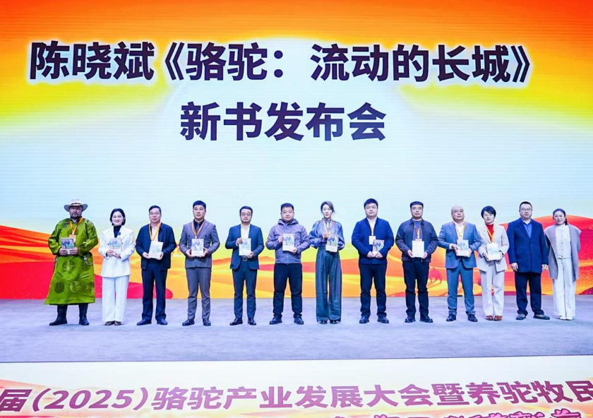 10月22日至24日,在甘肅省敦煌市舉辦的全國“第十屆(2025)駱駝產(chǎn)業(yè)發(fā)展大會”上,作家陳曉斌的新作《駱駝:流動的長城》正式發(fā)布。受訪者供圖