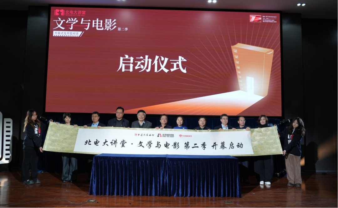 活動現(xiàn)場,閻晶明、周志軍和其他八位嘉賓共同拉開卷軸,啟動“北電大講堂·文學(xué)與電影”第二季。光影交織的瞬間,象征著文學(xué)與電影在新時代的再度攜手與共生。中國電影文學(xué)學(xué)會會長王興東、作家趙德發(fā)和衣向東作為文學(xué)界學(xué)術(shù)觀察員參加活動。