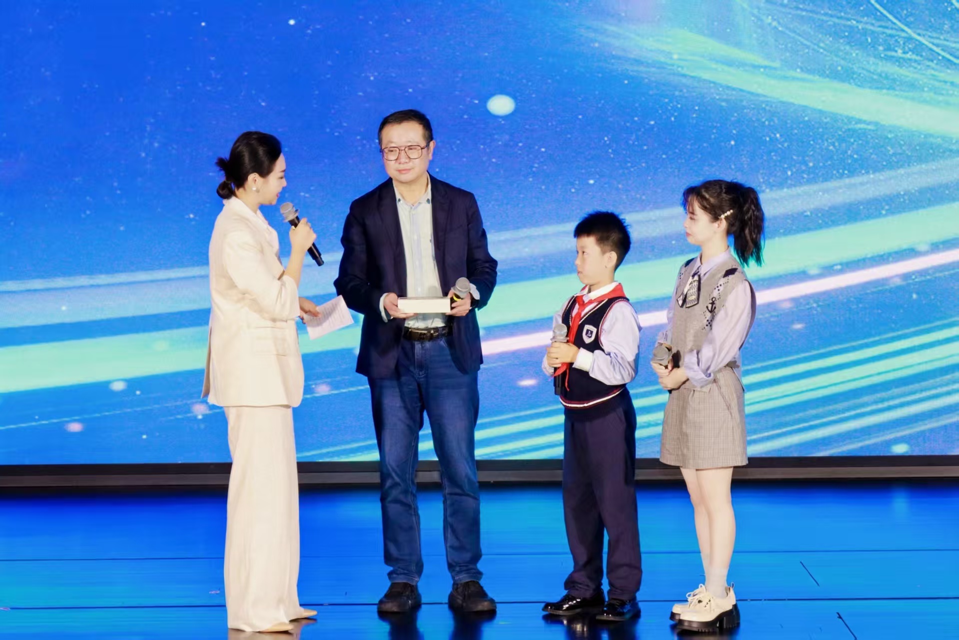 劉慈欣與到場讀者進行了熱烈的互動交流,與小讀者互贈禮物,現(xiàn)場還播放了讀者使用AI制作的劉慈欣作品視頻,昆山大學的學生演繹了科幻短劇。