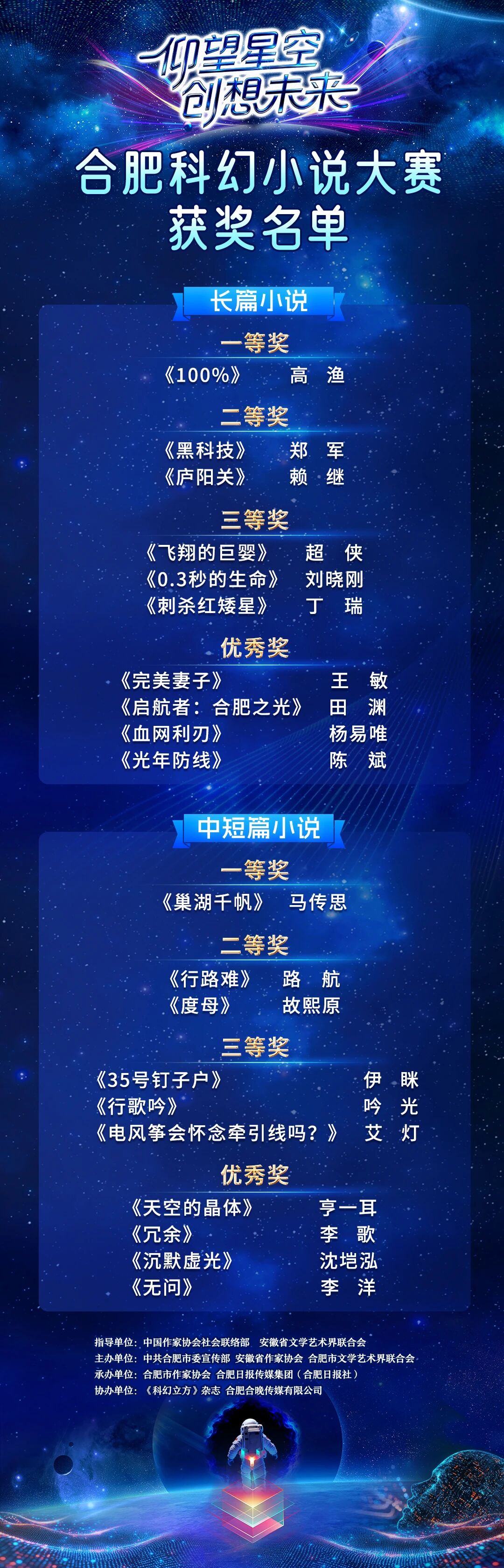 本次合肥科幻小說(shuō)大賽以“仰望星空 創(chuàng)想未來(lái)”為主題,經(jīng)過(guò)近半年時(shí)間征集,收到投稿作品1349部,共8000余萬(wàn)字,無(wú)論是參賽人數(shù),作品質(zhì)量,參選范圍,都遠(yuǎn)超預(yù)期,內(nèi)容涉及到星際探索、時(shí)空穿越、科技倫理、未來(lái)社會(huì)等多個(gè)科幻維度,通過(guò)層層篩選,嚴(yán)格評(píng)審,最終20部佳作脫穎而出。其中劉涼軍(高漁)的《100%》榮獲長(zhǎng)篇小說(shuō)一等獎(jiǎng);鄭軍《黑科技》、賴?yán)^《廬陽(yáng)關(guān)》榮獲長(zhǎng)篇小說(shuō)二等獎(jiǎng);超俠《飛翔的巨嬰》、劉曉剛《0.3秒的生命》、丁瑞《刺殺紅矮星》榮獲長(zhǎng)篇小說(shuō)三等獎(jiǎng);王敏《完美妻子》、田淵《啟航者:合肥之光》、楊易唯《血網(wǎng)利刃》、陳斌《光年防線》獲長(zhǎng)篇小說(shuō)優(yōu)秀獎(jiǎng);馬傳思《巢湖千帆》榮獲中短篇小說(shuō)一等獎(jiǎng),路航《行路難》、故熙原《度母》獲中短篇小說(shuō)二等獎(jiǎng);伊瞇《35號(hào)釘子戶》、吟光《行歌吟》、艾燈《電風(fēng)箏會(huì)懷念牽引線嗎?》獲中短篇小說(shuō)三等獎(jiǎng);亨一耳《天空的晶體》、李歌《冗余》、沈塏泓《沉默虛光》、李洋《無(wú)問(wèn)》獲中短篇小說(shuō)優(yōu)秀獎(jiǎng)。