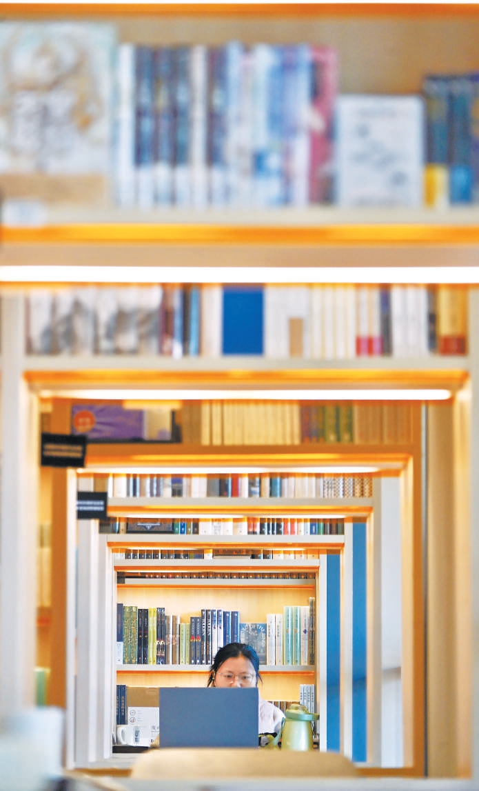 讀者在聯(lián)合書(shū)店·紫荊文化閱讀館里的書(shū)架間自習(xí)。北京日?qǐng)?bào)記者 程功攝
