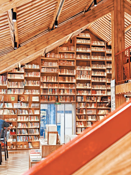 這家書(shū)店將社科、歷史類等非虛構(gòu)圖書(shū)放在一層,而文學(xué)、漫畫(huà)等虛構(gòu)類圖書(shū)居于二層。二層的書(shū)架依次排開(kāi),如同圖書(shū)館布局,自習(xí)臺(tái)和書(shū)架融合在一起,人和書(shū)無(wú)縫連接,誰(shuí)也離不開(kāi)誰(shuí)。