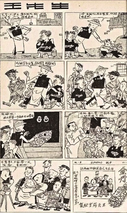 1934年,具有明星潛質(zhì)的“王先生”形象,被上海天一影片公司老板邵醉翁慧眼識得,改編拍攝了滑稽電影《王先生》,一夜躥紅。此后,影壇連珠炮似的涌現(xiàn)了11部系列影片,諸如《王先生的秘密》《王先生過年》《王先生吃飯難》《王先生奇?zhèn)b傳》《王先生夜探殯儀館》等,后期的影片基本脫離了漫畫,但沿用原作的人物關(guān)系,插科打諢,荒誕不經(jīng),越編越離譜。