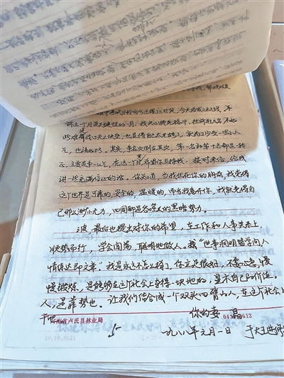 張沖波喜歡寫作,上中專時就堅(jiān)持記日記,至今,他的日記已累計(jì)百余萬字。張沖波說:“和她通信的同時我也記日記,日記更真實(shí),她的優(yōu)點(diǎn)缺點(diǎn)我在日記里寫的都有。當(dāng)時我還喜歡一個同事的妹妹,那段時間的思想斗爭也都寫在日記里了?!痹诰栀洭F(xiàn)場瀏覽他寫給駱淑景的信,其中不僅有熾熱的情愫,更有對人生、文學(xué)、社會的思考。而駱淑景的信,則滿是上進(jìn)心與通透感,讓張沖波的同事都忍不住稱贊:“這個女子不簡單,素質(zhì)高,有追求?!?/p>