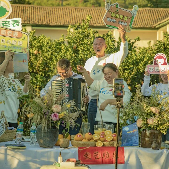 15日下午三點,在青塘鎮(zhèn)青塘村一個臍橙園,《星火》文青們插花、榨汁、擺雜志,幫果農(nóng)顧姐快速搭建起一個文藝氣質(zhì)濃厚的戶外直播間。四位90后文青來不及彩排就火線加入,開始了《星火》文藝助農(nóng)的直播首秀。