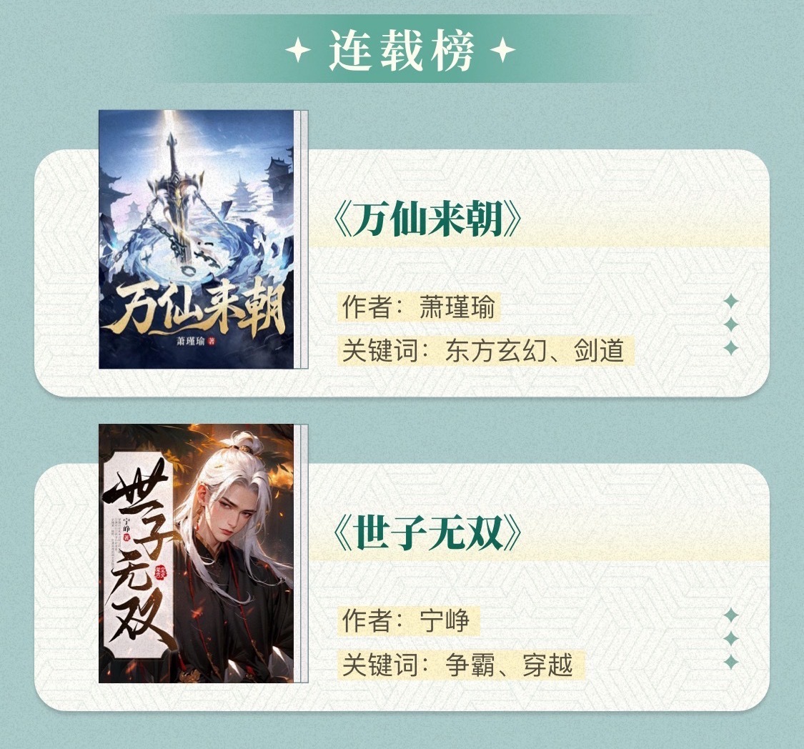 兩部入選連載榜的作品中,都在多線的敘事結(jié)構(gòu)下,將主角人物線與成長(zhǎng)線刻畫(huà)得更加飽滿。東方玄幻作品《萬(wàn)仙來(lái)朝》以“諸天為囚籠,萬(wàn)仙皆獄卒”為核心設(shè)定,搭建出格局開(kāi)闊的仙俠世界。大量配角各具性格與命運(yùn),卻故事線彼此牽連,形成完整的因果網(wǎng)絡(luò),共筑“守望相助”的仙俠世界觀。穿越題材作品《世子無(wú)雙》將穿越設(shè)定與權(quán)謀結(jié)構(gòu)緊密結(jié)合,以現(xiàn)代視角重構(gòu)古代權(quán)力博弈的解題路徑,人物內(nèi)核塑造清晰堅(jiān)韌。