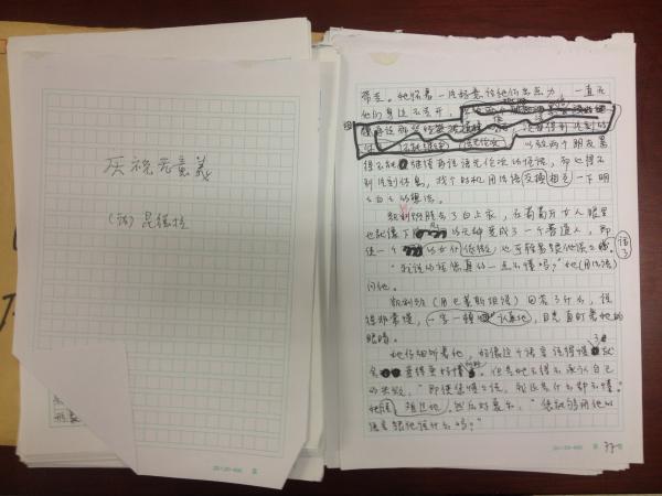 馬振騁翻譯《蒙田隨筆全集》全憑手寫,因?yàn)樗粫?huì)使用電腦打字。近2000頁(yè)的作文稿紙上,滿眼是不斷修改后留下的痕跡。馬振騁說,“我對(duì)自己的譯文還是滿意的,我想這樣一部書,在今后五年、十年也不會(huì)再有人去重譯了,畢竟這是件吃力不討好的事情,我是真的喜歡蒙田。”