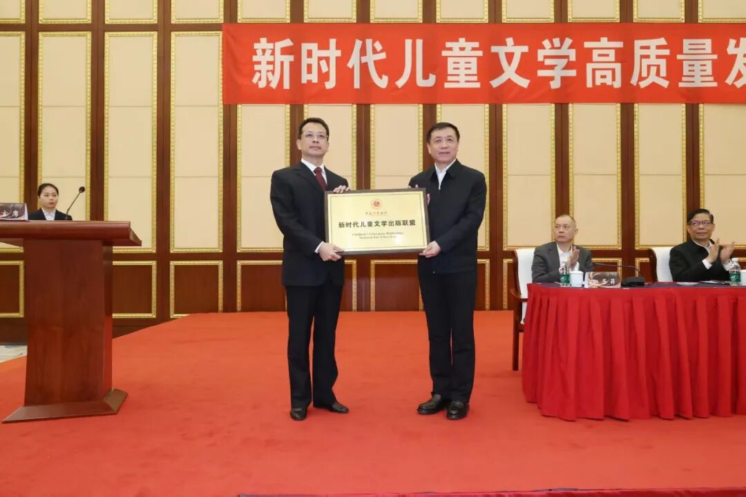 張宏森為中國(guó)作家協(xié)會(huì)新時(shí)代兒童文學(xué)出版聯(lián)盟授牌。曾銳接牌,并宣讀聯(lián)盟倡議書。