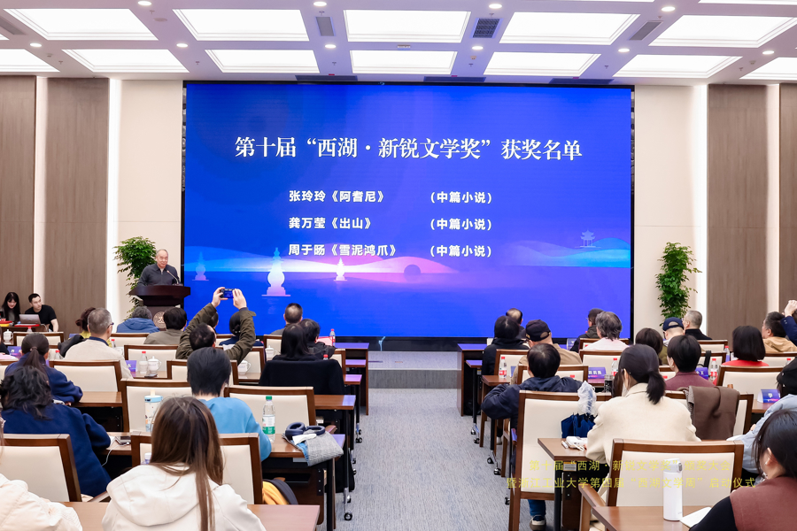 經(jīng)過終評委投票,張玲玲中篇小說《阿耆尼》、龔萬瑩中篇小說《出山》、周于旸中篇小說《雪泥鴻爪》獲第十屆“西湖·新銳文學(xué)獎”。11月17日上午,頒獎大會在浙江工業(yè)大學(xué)屏峰校區(qū)舉行。