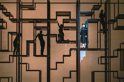 劇情推進(jìn)至麥基與波莉的婚禮場(chǎng)景,當(dāng)波莉唱起《海盜珍妮》時(shí),銀色幕簾緩緩升起,核心表演區(qū)才真正出現(xiàn)在觀眾眼前。舞臺(tái)由六個(gè)可移動(dòng)的巨型黑色幾何框架組合而成,框架內(nèi)分布著不規(guī)則的平臺(tái)、階梯與可開(kāi)合的機(jī)關(guān)板,供演員穿梭攀爬。不過(guò)在多數(shù)時(shí)候,演員會(huì)從不同方向爬至其中一個(gè)狹窄空間,在定點(diǎn)光的聚焦下直面觀眾表演。