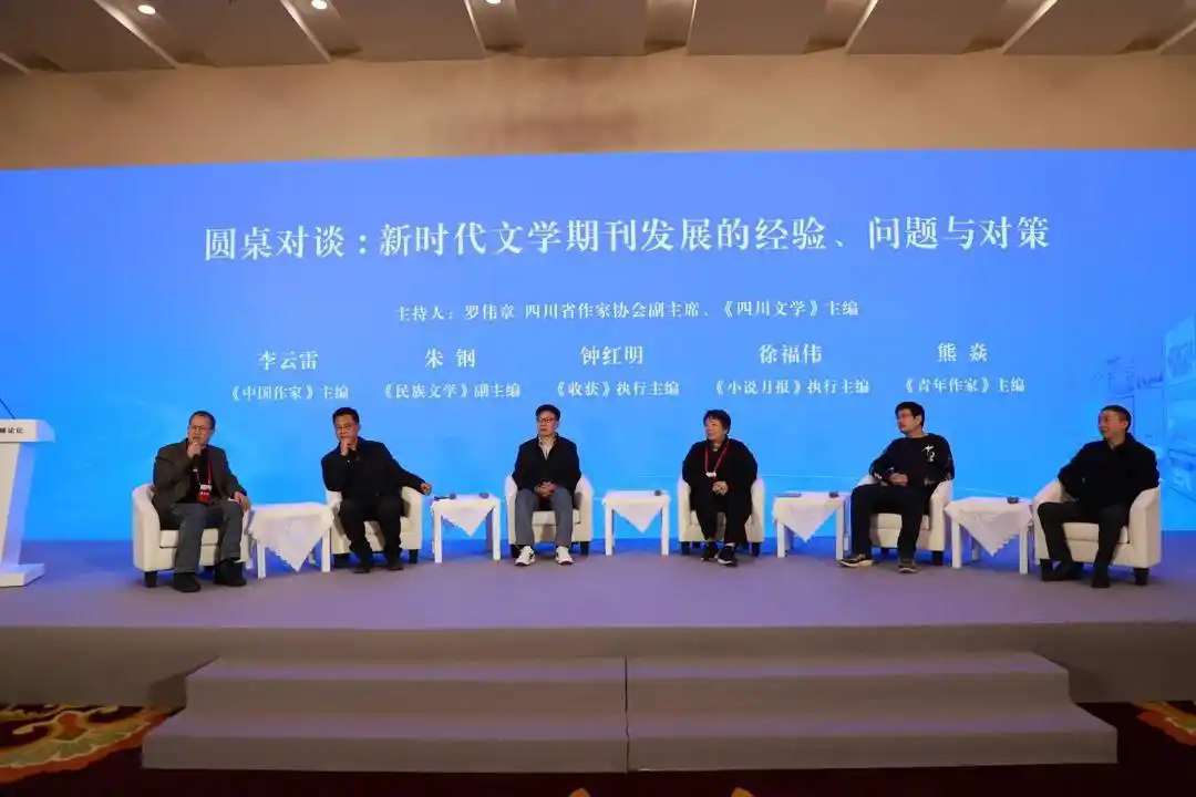 在由《四川文學(xué)》主編羅偉章主持的圓桌討論中,《中國(guó)作家》主編李云雷、《民族文學(xué)》副主編朱鋼、《收獲》執(zhí)行主編鐘紅明、《小說(shuō)月報(bào)》執(zhí)行主編徐福偉、《青年作家》主編熊焱,就“新時(shí)代文學(xué)期刊發(fā)展的經(jīng)驗(yàn)、問(wèn)題與對(duì)策”展開(kāi)深入對(duì)話。與會(huì)嘉賓結(jié)合辦刊實(shí)踐,分析當(dāng)前文學(xué)期刊發(fā)展中的難點(diǎn)與機(jī)遇,總結(jié)創(chuàng)新經(jīng)驗(yàn),共同探索高質(zhì)量發(fā)展路徑。其中李云雷在討論中特別提及新大眾文藝、素人寫(xiě)作等前沿議題。