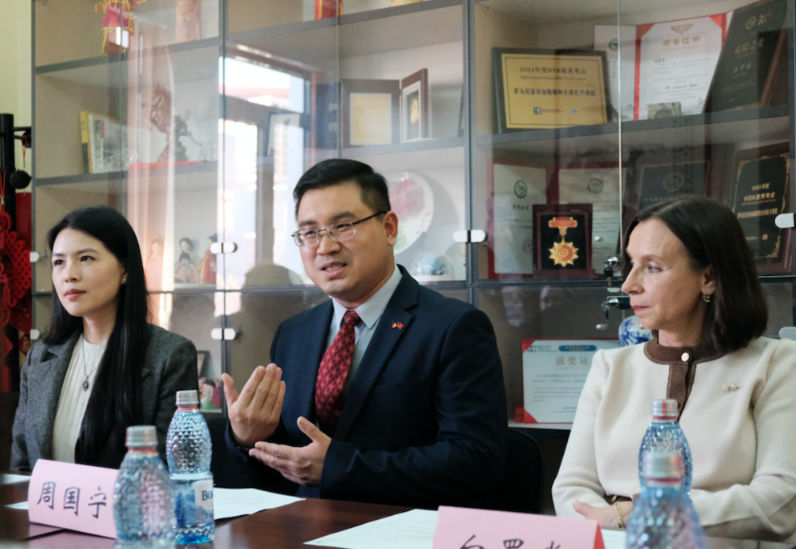 中國駐羅馬尼亞使館教育事務專員周國寧致辭。布加勒斯特大學孔子學院供圖