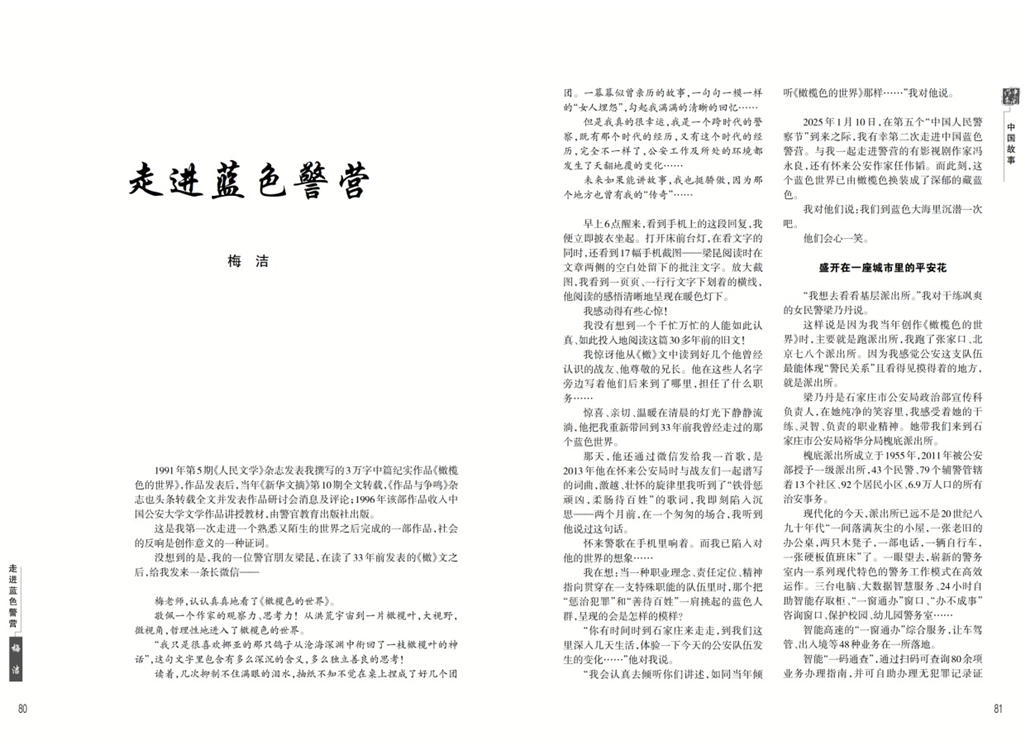 《走進藍色警營》是梅潔最新創(chuàng)作的一篇報告文學作品,發(fā)表于2025年第10期《中國作家》紀實版。在僅3萬字的篇幅中,作者用細膩的筆觸、豐沛的情感、宏闊的視野,不僅對河北省石家莊市公安局現(xiàn)代化進程進行了全景式記錄,更是對新時代人民警察精神圖譜的深情描繪。作品通過大量鮮活生動的細節(jié)描寫、典型人物的刻畫與典型事件的敘述,體現(xiàn)了“科技興警”的時代主題,弘揚了“人民公安為人民”的初心,其中對基層民警個體命運與精神的細膩刻畫,尤其是對呂建江、王永輝、謝宏偉、張文中、李永普等人物的描寫充滿敬意與感情,是英雄主義的謳歌,也是對普通人堅韌與奉獻的禮贊。作品真實記錄了新時代人民警察的忠誠與擔當,書寫了警民之間的深情與信任,內(nèi)容厚重、情感真摯,具有強烈現(xiàn)實意義和文學價值。