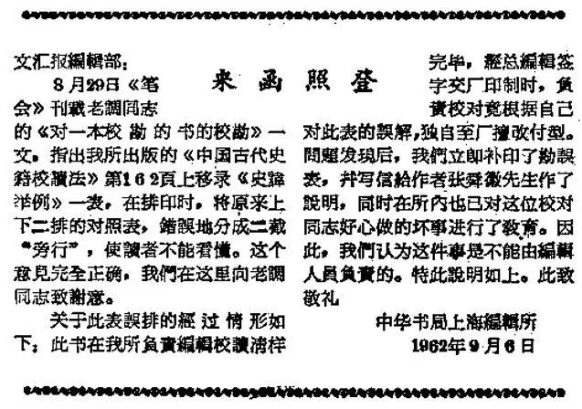 接下來(lái)想說(shuō)說(shuō)一樁舊事,雖則與上文說(shuō)的“錯(cuò)字”故事關(guān)系不大,但也屬于“誤書(shū)誤刻”一類。上?!段膮R報(bào)》1962年8月29日第四版“筆會(huì)”曾登過(guò)一篇《對(duì)一本講校勘的書(shū)的??薄?,署名“老調(diào)”,文章指出了中華書(shū)局上海編輯所1962年7月出版的張舜徽《中國(guó)古代史籍校讀法》一書(shū),第162頁(yè)至163頁(yè)講史籍避諱一章時(shí),引用了陳垣《史諱舉例》的一處表格,原本應(yīng)是上下兩欄一一對(duì)應(yīng)的關(guān)系,表明同一人在不同史籍中因避諱而造成的不同稱呼。這張表排版竟完全錯(cuò)亂,看不出上下對(duì)應(yīng)的關(guān)系。似是將原稿的上下對(duì)應(yīng),理解為“旁行”(即古籍中有橫著兩行或數(shù)行排列的地方,不是豎讀,而是從右往左橫讀,一行讀完,再讀下一行)關(guān)系,又按版面重排,竟致表的意義完全不能理解。中華書(shū)局上海編輯所則在1962年9月11日“筆會(huì)”的“來(lái)函照登”欄目進(jìn)行了回應(yīng):