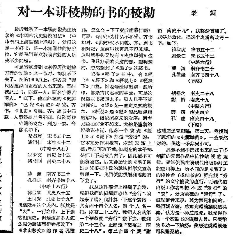 今天《文匯報(bào)》有《中國(guó)古代史籍校讀法》的批評(píng),查此書(shū)由我擔(dān)任通讀,當(dāng)時(shí)對(duì)此表并未讀過(guò),認(rèn)為已校過(guò)多次,一般的讀不易發(fā)現(xiàn)問(wèn)題,為求急于出書(shū),便未細(xì)讀,否則四十四人同姓不同名的上下相對(duì),當(dāng)不難理解,卻只看到此表上排多有“宋書(shū)”,下排多有“南史”字樣,也當(dāng)作旁行。蓋因此書(shū)38頁(yè)的表,提到旁行與直行的錯(cuò)誤,又有152頁(yè)的表,作者也誤作直行,(其他類似的更多)便突然加以校改,卻把上文“彼此二書(shū),同敘一人”的一段話疏忽了,實(shí)為主因。
